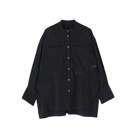 バンドカラーのシャツで随所に透けない素材をドッキングしています。