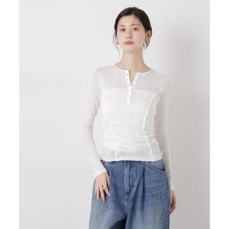 品のある透け感とヘンリーネックで仕上げた首元がトレンド感のあるロングTシャツ。一枚ではもちろん、2色を重ねたりお手持ちのアイテムとレイヤードした旬な着こなしもおすすめです。