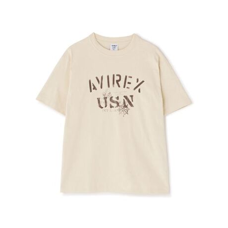 ・ヴィンテージライクなTシャツ・フロントには「AVIREX USN」のステンシル調ロゴが大きく配置・背面にはさりげなくワンポイントのロゴプリント・古着のような風合いを持つ生地
