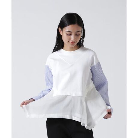 コットンスムースの素材をベースに、袖にはストライプのシャツ地、裾にはシアー感のあるペプラムパーツをつけた、1枚でさらりと着こなせるプルオーバー。