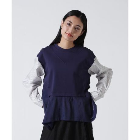 コットンスムースの素材をベースに、袖にはストライプのシャツ地、裾にはシアー感のあるペプラムパーツをつけた、1枚でさらりと着こなせるプルオーバー。