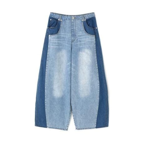 2種類のデニムを大胆に切り替えたカラーブロックデザインが目を惹く、コクーンシルエットのデニムパンツ。