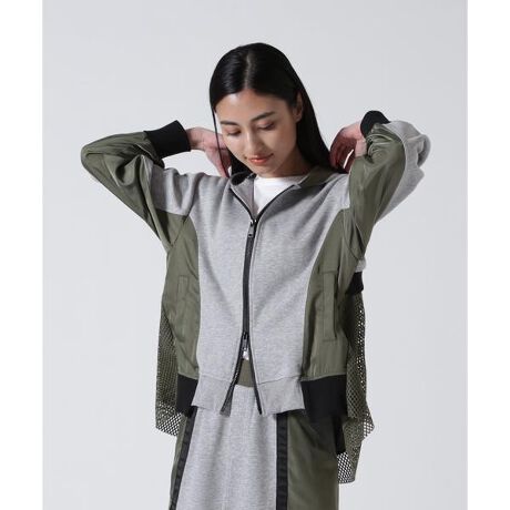 スポーティーなパーカーに、フェミニンなエッセンスをプラスした異素材ドッキングデザイン。