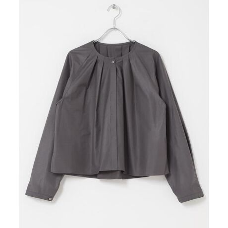 ポリエステルとコットンを混紡したタフタ素材に絶妙な光沢を引き出す加工を施し、カジュアルさと上品さを併せ持つ風合いに仕上がったブラウスは、オンオフどちらのシーンにも馴染みます。シワになりにくく、ご自宅で簡単にお手入れができるのも忙しい日常に嬉しいポイント。襟ぐりや袖口に施したタックが、空気を孕んだような柔らかなシルエットを描きます。フロントは比翼仕立てですっきりとまとめ、第一ボタンをアクセントを。腰回りがもたつかないショート丈なので、裾をインせずとも自然にスタイルアップを叶えます。
