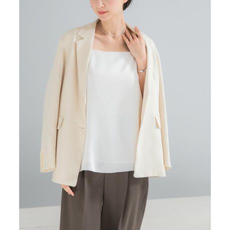 表面に繊細な凹凸を施した、ニュアンス豊かなサテン素材を使用し、ほんのりと光を纏うような質感は、お顔周りを明るく知的な印象に。シワになりにくく、上質な風合いを長く保てるのも嬉しいポイント。胸元の直線的なラインと、華奢な肩ひもが女性らしさを引き立て、サイドに施したスリットが着こなしにさりげない抜け感を演出。大人の日常に、そっと品格を添えてくれる一着に仕上げました。シャツやジャケットのインナーに忍ばせて、艶感を覗かせるのがおすすめ。いつものスタイルに重ねるだけで、ぐっと鮮度の高い着こなしが完成します。同素材のシャツやスカートを合わせた、統一感のあるセットアップスタイルもぜひお楽しみください。