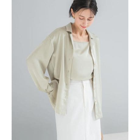奥行きのある光沢が、日常をクラスアップしてくれるサテンシャツが登場。表面にほんのりと凹凸のある表情豊かなサテン素材を使用し、ニュアンスのある光沢が、コーディネートに奥行きと上品な華やぎを添えてくれます。シワになりにくく、大人の余裕を感じさせる洗練された風合いが魅力。シャープな開襟デザインが、顔周りをすっきりと知的な印象に見せてくれ、装飾を削ぎ落としたミニマルな仕上がりが、素材の良さを一層引き立てます。袖口の細いカフスとタックが、手元に繊細で女性らしい動きを演出。少しゆとりのあるサイジングにこだわり、一枚着としても羽織りとしても美しく決まります。同素材のスカートやキャミソールを合わせた、贅沢なセットアップスタイルもおすすめです。
