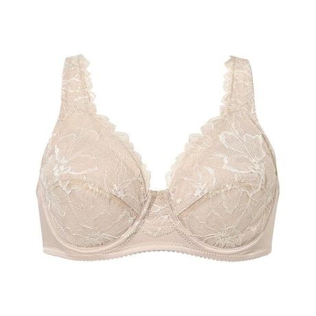 ●やさしいつけごこち ワイヤーは外付け アンダー部分全体に伸縮性をもたせ、快適なつけごこち ストラップのサイドからバック上辺と、アンダーは伸びのよいストレッチテープを使用●カップ肌側と土台からバックにかけてはやさしい肌ざわり カップ肌側は綿混素材を、土台からバックにかけては綿混パワーネットを使用●ボーンの肌あたり軽減設計 脇ささえボーンがバック生地の中に縫製され、直接肌にあたらない設計仕様「ワイヤーブラになんとなく抵抗感がある」という方におすすめのフルカップブラ。外付けワイヤーを使用しており、肌側のあたりを軽減します。バストを広範囲に包みこみ、肌になじむようなつけごこちです。前中心のアンダー部分やカップ部分はしなやかで、からだにやさしくフィット。長距離移動や旅先など、気楽にブラをつけたいシーンなどにも活躍します。花がふわりと咲いたようなレースのデザインはやさしい気持ちにしてくれそう。●詳細情報ワイヤーありホック後ろ留め(B・C・D・E70-85)ホック2段3調節(F, B・C・D・E90-100)ホック3段3調節パッド受けなしボーンあり※お洗濯は、必ず「取扱い表示」にしたがってください。