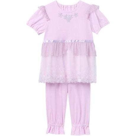 【女児用パジャマ】トップス袖丈:半袖(3分袖)・ボトム脇丈:7分丈・かぶりタイプ【ワコール プレミアム】キラキラ、ふわふわ、かわいいものにいつも囲まれていたいお子さまのために、素材やディテールにこだわったプレミアムグループ●プリンセス気分になれるキッズパジャマで、女の子の“かわいい”をぎゅっと詰め込んだ、夢のようなデザイン●ネックにはキラキラ輝くラメ入りアップリケで、顔まわりを華やかに●トップスには繊細なラメ入りエンブロイダリーレースをたっぷり使用して、上品で美しい印象にさらに、レースの上にはふんわりラメ入りチュールを重ねて、まるでお姫様みたいなふわっと感を演出●袖はふんわりかわいいパフスリーブで、動くたびにキュートさ倍増●おやすみ時間も特別な気分にしてくれる、キッズパジャマ。お子さまの“プリンセスになりたい”気持ちを叶える、ママも納得の一着です●本体に、光沢がありなめらかな肌ざわりをもつ上質な細い番手の綿100%スムース素材を使用(60綿スムース素材)・肌側に名前が記入できるネーム付き・ボトムの前肌側にネームを付けることで、はく時に前後の目安になりやすい・ウエストゴム取り替え口あり※お洗濯は、必ず「取扱い表示」にしたがってください。