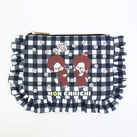レトロなモンチッチのアートがかわいいギンガムチェックフリルシリーズです!少し大きめのポーチは内ポケット付きで小物をスッキリと持ち歩けます◎