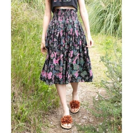 [型番:IAC-6131-2026]旅するカラベラが、タイの水かけ祭り「ソンクラーン」楽しんでいる様子を描いた総柄スカート。軽やかなレーヨン素材、短め丈で脚さばきもよく、ボヘミアンな一枚。マリーゴールドやタイの国花ラーチャプルックをボヘミアンな雰囲気で散りばめました。