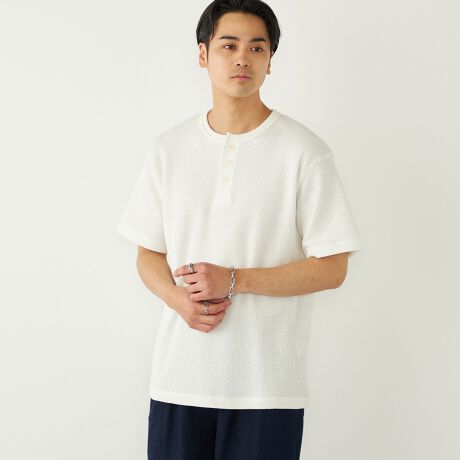 襟元にボタンを配したヘンリーネック型で、普段のTシャツコーディネートとは違った雰囲気をもたらしてくれる1枚。