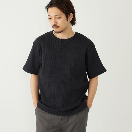 襟元にボタンを配したヘンリーネック型で、普段のTシャツコーディネートとは違った雰囲気をもたらしてくれる1枚。
