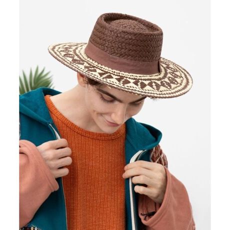 ツバ部分に幾何学柄が編み込まれたナチュラルなカンカン帽。素朴な素材感に遊び心ある柄が映え、普段使いや旅先でも活躍。サイズ調整可能。