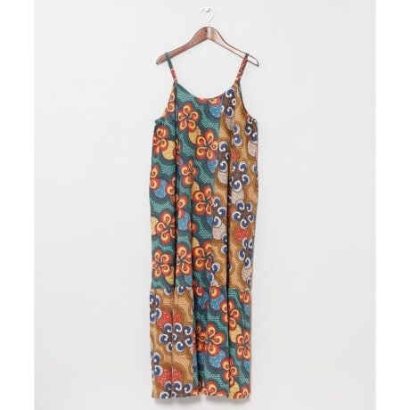 [型番:IAC-6141-2026]アフリカの民族布キテンゲをイメージしたパッチワーク風デザインのキャミワンピース。ティアードのシルエットが女性らしさを引き立て、肩紐で着丈の調整も可能。明るく元気なカラーで、お出かけにもぴったりの一枚。
