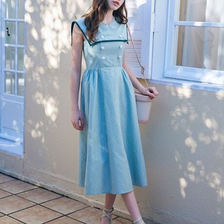 シーズンムードを感じさせてくれるストライプ柄のマリンワンピース。