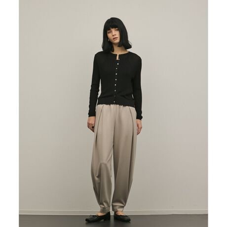 [型番:0326253324]繊細なラメの入った柔らかな合繊混のクルーネックニットカーディガン。同型素材でおつくりしたラメリブグルーニットトップ【品番:0326243322】のご用意もございます。※こちらのモデル着用画像はサンプル品を撮影しております。実際の商品と仕様、加工、サイズが若干異なる場合がございます。予めご了承くださいませ。
