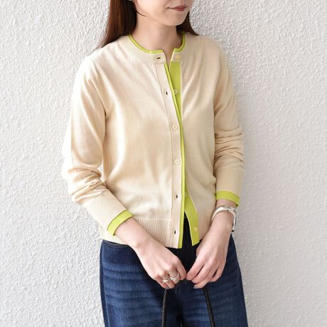 袖と襟元からフロントにかけて施した配色の切替がアクセントになったカーディガン。