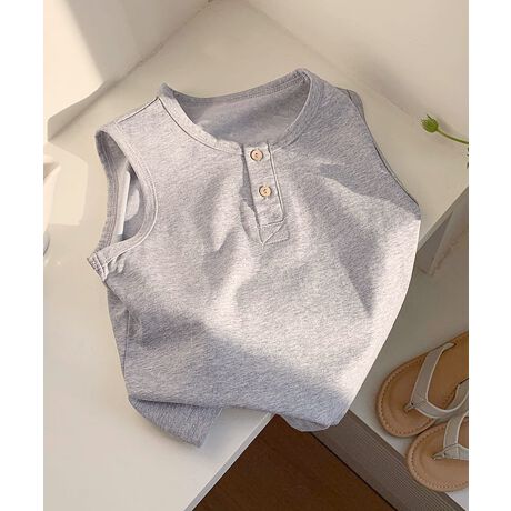 胸元と肩部分に施されたボタンデザインが可愛らしいアクセントになり、着脱がしやすいのもポイント。シンプルながらもナチュラルな風合いが感じられ、細部まで丁寧に仕上げられた縫製で動きやすさも抜群です。