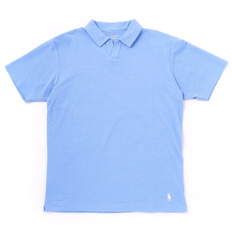 コットンと環境に配慮されたリサイクルポリエステルを混紡した、ニットシアサッカー素材のジョニーカラーショートトップシャツです。高いストレッチ性と、生地表面の凹凸がもたらす清涼感が特長。リラックス感のあるジョニーカラー(スキッパー)デザインや、無地でありながら織柄がストライプに見える表面感、軽い着心地も魅力です。左裾にホワイトで入れたブランドアイコンのポロプレイヤー刺繍もポイント。同素材を使用したショートパンツ(RM8-D303)も展開しているので、セットアップでの着用もオススメです。