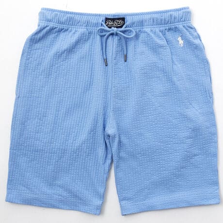コットンと環境に配慮されたリサイクルポリエステルを混紡した、ニットシアサッカー素材のスリープショートパンツです。高いストレッチ性と、生地表面の凹凸がもたらす清涼感が特長。無地でありながら織柄がストライプに見える表面感、軽い着心地も魅力です。フロントの中央部に縫い付けたラベルと、左ウエスト部分にホワイトで入れたブランドアイコンのポロプレイヤー刺繍もポイント。同素材を使用したショートスリーブクルーネックシャツ(RM8-D204)、ジョニーカラーショートトップシャツ(RM8-D205)、ショートスリーブパジャマトップシャツ(RM8-D206)も展開しているので、セットアップでの着用もオススメです。