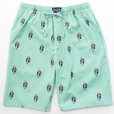 [型番:RM8-D401]コットン100%の平織生地のスリープショートパンツです。なめらかで光沢のある素材感が特長。膝丈のリラックスフィットで、日常的な動きにスムーズに対応します。クラシックなストライプ柄にPOLOベア(モーニングローブベア)をオールオーバープリントした、ギフトにも最適なアイテムです。フロント中央部に縫い付けたラベルもポイント。両サイドにポケット付きです。