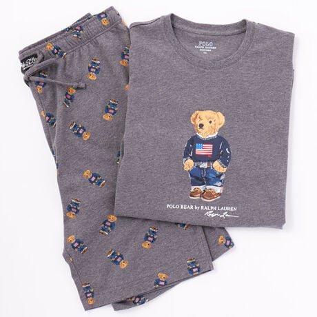 オーガニックコットン100%のショートスリーブクルーネックシャツとスリープショートパンツのスリープウェアセットです。柔らかで肌触りの良い天竺生地による快適な着心地が特長。トップスは着丈と身幅にゆとりを持たせた着心地の良いリラックスフィット。トップスの前身頃にはアイコニックなPOLOベア(コアフラッグセーターベア)をプリントし、ボトムスはトップスと同じPOLOベアをオールオーバープリントした、ギフトにも最適なアイテムです。フロント中央部に縫い付けたラベルもポイント。両サイドにポケット付きです。
