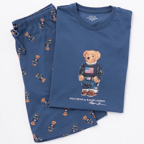 オーガニックコットン100%のショートスリーブクルーネックシャツとスリープショートパンツのスリープウェアセットです。柔らかで肌触りの良い天竺生地による快適な着心地が特長。トップスは着丈と身幅にゆとりを持たせた着心地の良いリラックスフィット。トップスの前身頃にはアイコニックなPOLOベア(コアフラッグセーターベア)をプリントし、ボトムスはトップスと同じPOLOベアをオールオーバープリントした、ギフトにも最適なアイテムです。フロント中央部に縫い付けたラベルもポイント。両サイドにポケット付きです。
