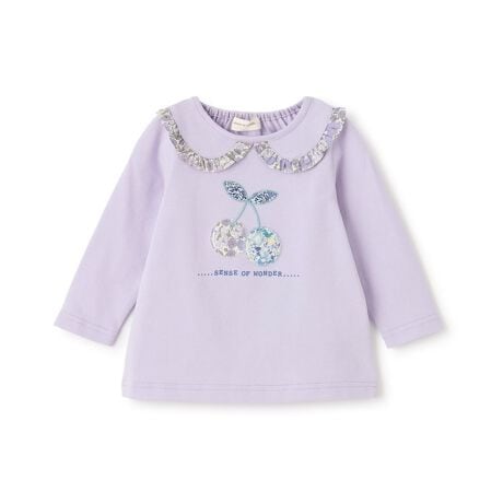 フリルつきの見せかけ衿とチェリーモチーフがかわいい長袖Tシャツです。