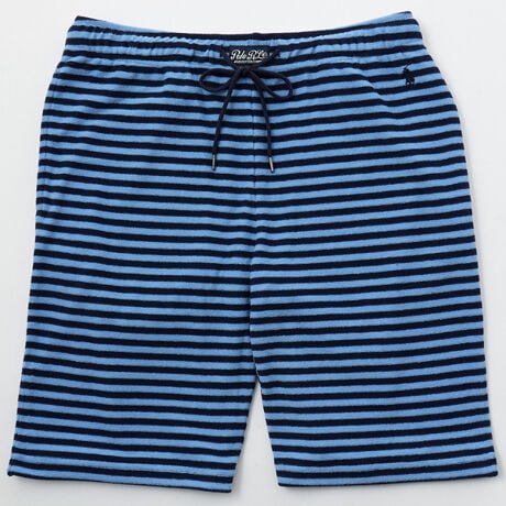 [型番:RM8-D305]コットンをベースに、環境に配慮されたリサイクルポリエステルを混紡した、柔らかな風合いで肌当たりの良いテリークロス(パイル)素材のスリープショートパンツです。乾きやすさと軽い着心地が特長。フロント中央部に縫い付けたラベルと、左ウエスト部分に入れたブランドアイコンのポロプレイヤー刺繍もポイントです。同素材を使用したショートスリーブクルーネックシャツ(RM8-D208)も展開しているので、セットアップでの着用もオススメです。