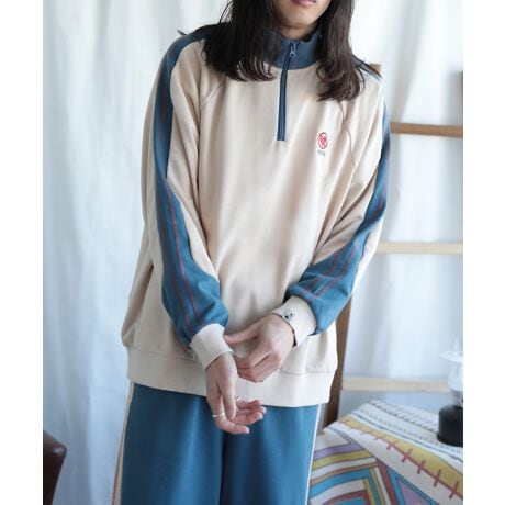 袖の切り替え線がカーブなっているユニークな配色スウェットハーフジップ