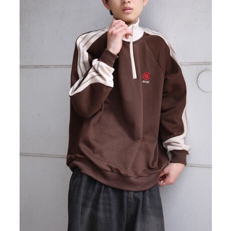 袖の切り替え線がカーブなっているユニークな配色スウェットハーフジップ