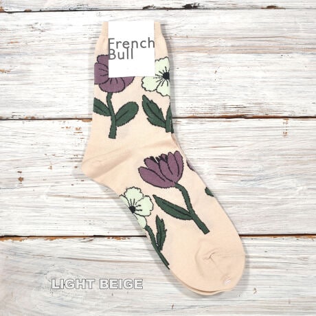 並んだお花がゆらゆらと風に揺られてダンスをしているような柄のソックスです。ベースはガス焼き処理により毛羽を抑えたシルケットの綿糸で、薄く編み立てました。優しいペールトーンをベースにした春夏らしい配色が足元を華やかにしてくれる1足です。足元を主役にしたスタイリングも素敵ですね♪