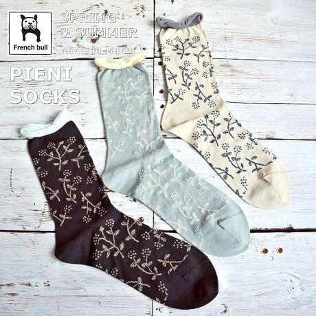 小花柄のソックスです。ベースはガス焼処理により毛羽を抑えたシルケットの綿糸で、薄く編み立てました。履き口がくるくるしているので締め付け感が少なく、つま先はリンキング仕様であたりのない快適な履き心地です。落ち着いた配色が合わせやすく、コーディネートのポイントになる1足です。