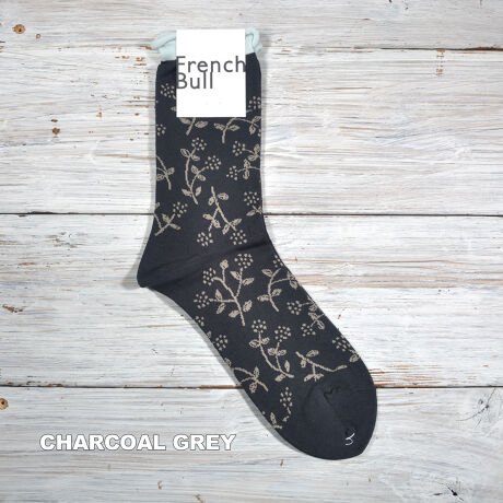 小花柄のソックスです。ベースはガス焼処理により毛羽を抑えたシルケットの綿糸で、薄く編み立てました。履き口がくるくるしているので締め付け感が少なく、つま先はリンキング仕様であたりのない快適な履き心地です。落ち着いた配色が合わせやすく、コーディネートのポイントになる1足です。