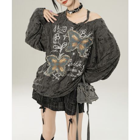 蝶々のデニムパッチがポイントのダメージ透かしニットソー