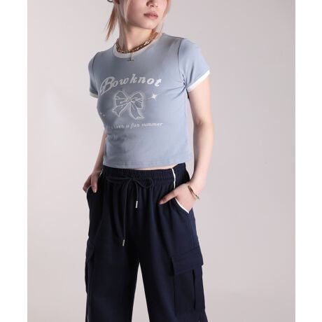 かわいらしいリボンプリントが特徴の、ストリート女子にぴったりのTシャツ。