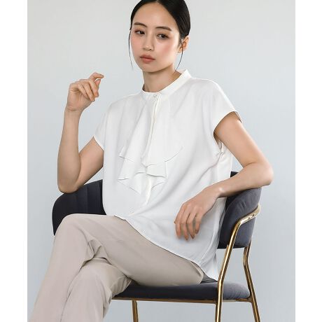 胸元フリルが華やかさを演出するブラウス。