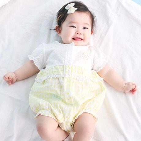 ウエストにはふんわりとしたフリルを重ね、さらにレースもあしらって、赤ちゃんの可愛さをいっそう引き立てるガーリーなデザインに仕上げています。