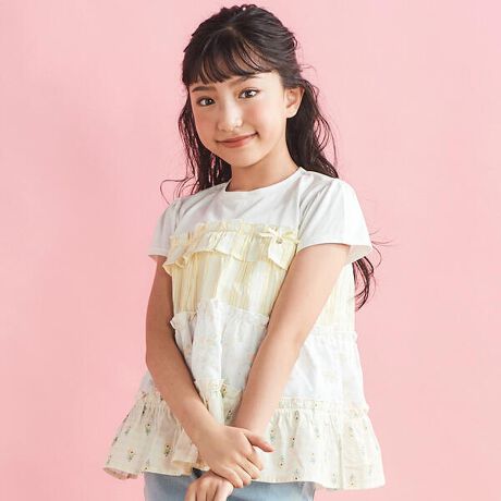 ストライプや花柄の生地をふんわり重ねた、ティアードデザインが可愛らしい女の子用半袖Tシャツ。