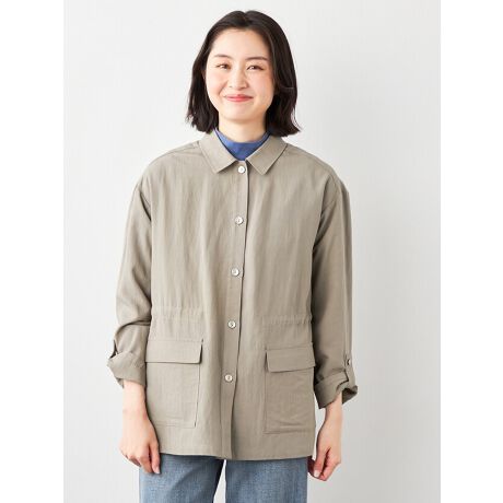 [型番:6251009]レーヨンナイロン素材のさらりとしたライトジャケットです。調整が出来るウエスト周りのギャザーや袖のロールアップ仕様がポイント、様々なシーンに合わせて軽やかな春〜初夏のスタイルを楽しめます。ナチュラル感とドライタッチが特徴のデイリーなアイテムです。
