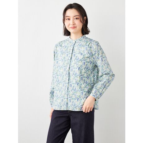 [型番:6251202]華やかなフラワーモチーフのプリントブラウスです。すっきりとしたバンドカラーと、肩に入れたギャザーが春らしい軽やかな印象に。春のお出かけやデイリーコーデの主役になるとっておきの1枚です。コットン素材ならではの清潔感と柔らかな気心地を兼ね備えた魅力あるブラウスです。