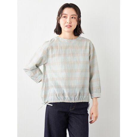 [型番:6251220]清潔感のあるドライタッチなチェック柄ブラウスです。さらりとした素材感とニュアンスあるカラーコンビネーションが上品な印象に。体のラインを拾わない、ゆったりとしたサイズ感で裾に通した紐を調整してお好みのシルエットをお楽しみいただけます。1枚で様になるデザインが魅力のブラウスです。