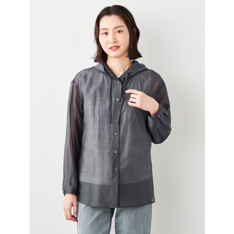 [型番:6251221]微光沢のあるオーガンジー素材のフード付きパーカーです。まだ寒さを感じる季節の変わり目に、重たくなりすぎない軽やかな印象のアイテムです。爽やかなサックスブルーと合わせやすい墨黒で透け感もほんのりと丁度良い、旬のスタイルが楽しめます。いつものコーディネートに合わせるだけで新鮮なスタイルに。