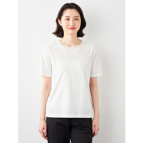 エレメント春夏の定番インナーカットソーシリーズの半袖Tシャツです。肌に触れたときに冷たく感じる接触冷感加工が施されています。シルクを思わせる光沢感があり、衿元の繊細なハシゴ刺繍をアクセントにジャケットのインとしてきれい目なスタイルがお勧めです。洗濯を繰り返しても毛羽立ちが少なくデイリーに着まわしたい安心感のあるアイテムです。今季のカラーは定番のオフ白に加え、ラベンダー、イエロー、ネイビーの4色展開です。