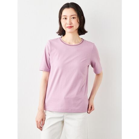 エレメント春夏の定番インナーカットソーシリーズの半袖Tシャツです。肌に触れたときに冷たく感じる接触冷感加工が施されています。シルクを思わせる光沢感があり、衿元の繊細なハシゴ刺繍をアクセントにジャケットのインとしてきれい目なスタイルがお勧めです。洗濯を繰り返しても毛羽立ちが少なくデイリーに着まわしたい安心感のあるアイテムです。今季のカラーは定番のオフ白に加え、ラベンダー、イエロー、ネイビーの4色展開です。
