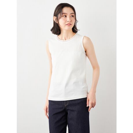 エレメント春夏の定番インナーカットソーシリーズのタンクトップです。肌に触れたときに冷たく感じる接触冷感加工が施されています。シルクを思わせる光沢感があり、衿元の繊細なハシゴ刺繍をアクセントにジャケットのインとしてきれい目なスタイルがお勧めです。夏にはシアー感のあるブラウスのインナーとしても最適です。洗濯を繰り返しても毛羽立ちが少なくデイリーに着まわしたい安心感のあるアイテムです。今季のカラーは定番のオフ白に加え、ラベンダー、イエロー、ネイビーの4色展開です。