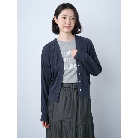 [型番:6251602]透け感あるランダムリブが特徴のカーディガンです。麻特有のさらりとした肌心地が気持ち良い、初夏にぴったりなアイテムです。くしゅっと畳んで持ち歩けるカーディガンは気温調整や初夏の陽射し除けに1枚あると便利なお勧めのアイテムです。デニムに似合う赤みあるオレンジとベーシックに使えるネイビー、グレーの3色を用意しました。