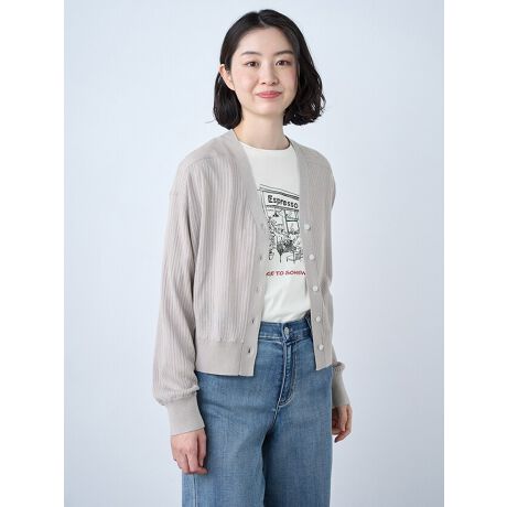 [型番:6251602]透け感あるランダムリブが特徴のカーディガンです。麻特有のさらりとした肌心地が気持ち良い、初夏にぴったりなアイテムです。くしゅっと畳んで持ち歩けるカーディガンは気温調整や初夏の陽射し除けに1枚あると便利なお勧めのアイテムです。デニムに似合う赤みあるオレンジとベーシックに使えるネイビー、グレーの3色を用意しました。