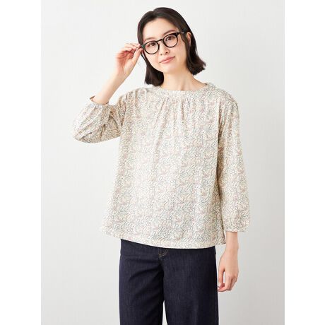 [型番:6251712]軽い肌触りが魅力の綿天竺素材に手描き風のフラワープリントを施したカットソープルオーバーです。かすれたタッチの花や葉をあしらったプリントは遊び心があり明るい印象に仕上げています。首元のさりげないギャザーが女性らしさをプラスして、後ろ衿のゴムギャザーはデザインポイントになりつつ、着脱のしやすさも考えた仕様です。コーディネートの差しアイテムとして取り入れたいパッと華やぐ1枚です。デニム合わせで若々しいスタイリングがおすすめです。