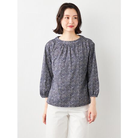 [型番:6251712]軽い肌触りが魅力の綿天竺素材に手描き風のフラワープリントを施したカットソープルオーバーです。かすれたタッチの花や葉をあしらったプリントは遊び心があり明るい印象に仕上げています。首元のさりげないギャザーが女性らしさをプラスして、後ろ衿のゴムギャザーはデザインポイントになりつつ、着脱のしやすさも考えた仕様です。コーディネートの差しアイテムとして取り入れたいパッと華やぐ1枚です。デニム合わせで若々しいスタイリングがおすすめです。